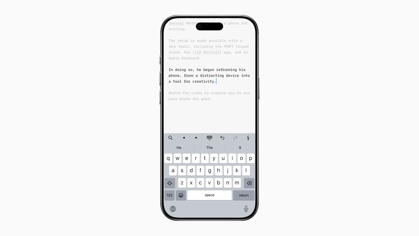 The setup is made possible with a few tools, including the MOFT tripod stand, the iA Writer app, and an Apple keyboard.